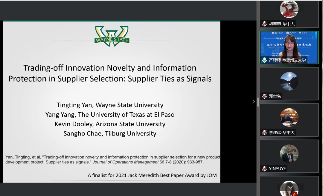 严婷婷以“Trading-off Innovation Novelty and Information Protection in Supplier Selection: Supplier Ties as Signals”为主题分析了供应链关系对企业创新的影响,报告由张意成主持。严教授选取了供应商的创新新颖性和企业的信息保护这两个因素,研究了企业创新时这些因素对其供应商选择的影响。
