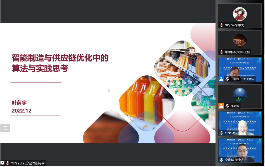 叶荫宇以“智能制造与供应链优化中的算法与实践思考”为主题,讨论了现代企业在制造和供应链中存在的多个智能决策问题,并从其中的智能定价、安全库存管理、调度系统、碳排放管理等管理领域深入且详尽地阐述了如何更有效地运用运筹学。