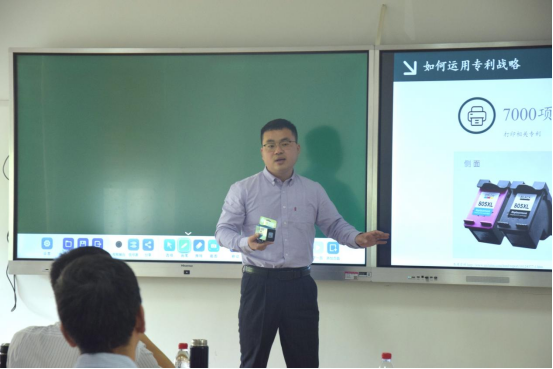刘金鑫带来的课程是《创新创业管理》中的“专利战略”。他以惠普公司打印机业务所采取的战略布局为例,层层递进地介绍了专利战略的概念、基本布局和主导性设计在专利战略中的先进性,同时也以“柯达”为例批判性地提出了主导性设计可能带来的风险问题。