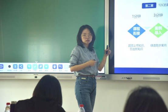 王玥以《高级生产计划与控制》这一课程中“约束理论”进行授课展示,以“整队跑步训练”举证阐述了瓶颈资源与非瓶颈资源的定义。她提到,瓶颈是制约系统效率的关键环节,只有通过不断“挖掘”、“迁就”、“松绑”和“回头”,才能找到并解决瓶颈问题。