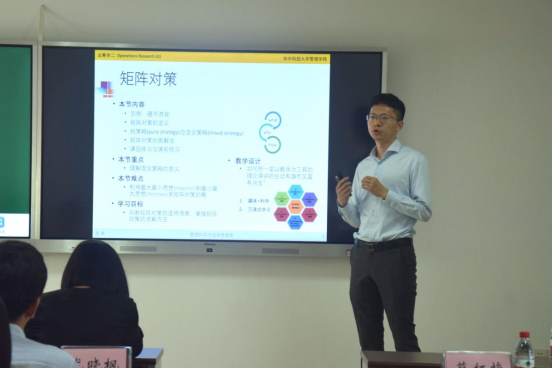 盛典以《运筹学》中的“矩阵策略”进行教学展示,主要讲解了矩阵对策的概念和求解方法。他以硬币游戏引出了课程讨论主题,又以田忌赛马为例讲解了矩阵对策的定义,并在具体的假设情境下,分别讲解了最优纯策略求解和混合策略求解的过程。