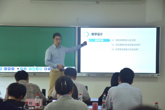 蔡俊选取的是《管理经济学》中的“消费者效用选择理论”。他首先带大家回顾了效用的定义及测度,接着以“集贤楼食堂的早餐选择”这一高度生活化的趣味案例贯穿整节课堂,介绍了边际效用递减的现象、原因,以及效用最大化的条件,并呼吁大家要进行理性消费。
