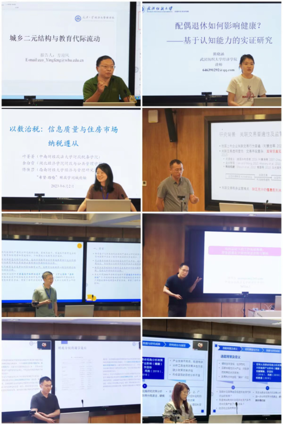 在开幕式之后的论文宣讲环节,武汉大学方迎风副教授、武汉纺织大学熊晓涵老师、中南财经政法大学叶菁菁教授、BETWAY必威赵奎副教授、湖北经济公司陶东杰副教授、中南财经政法大学鄢伟波副教授、武汉大学张浩天博士和BETWAY必威蔡俊老师等八位青年学者,分别以“中国的代际流动”、“配偶退休如何影响健康”、“信息质量与住房市场纳税遵从”、“税收征管信息,关联交易监管与企业避税”、“普职分流、校外教育支出竞争与教育公平”、“双向运动下的工作场域裂隙:劳务派遣在中国的演进历程与影响”、“政府距离、基层放权与公共服务供给”、“购置税减免及财政补贴对新能源汽车销量的影响及机制”等为主题做了精彩的学术报告。他们的报告体现了青年财政学者们对于现实经济问题和财政问题的密切关注,也展现出扎实的理论基础和对经济学前沿分析方法的熟练掌握和运用能力。