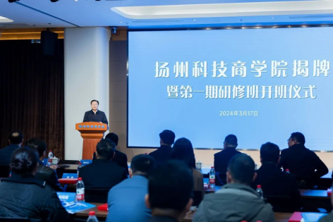 揭牌仪式上,扬州市科技局局长王友芳介绍了扬州科技商公司及第一期研修班的组建情况。53位来自扬州“613”产业体系优势科技型企业家学员,以及12位来自市直机关部门选派的跟班学员参加第一期学习。