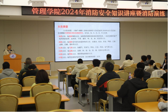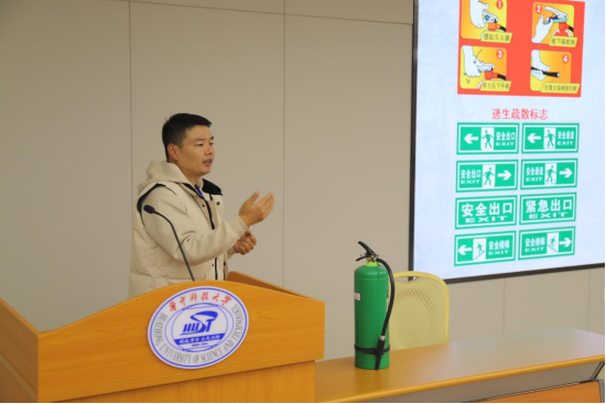 接着,蒋卫东队长图文并茂地讲解了消防知识,同时,也介绍了校保卫处的工作职责,提醒同学们在校期间如遇突发灾难要立即拨打保卫处报警电话87541110。在讲授过程中,他暨解释了火灾的含义、类型和等级划分,也结合案例视频分析了生活中常见火灾的起因与隐患,以及火灾发生初期的灭火技能和逃生技能等;他特别指出,公司消防安全重点部位是宿舍、实验室、图书馆等人员或可燃物密集场所;他告诉我们,火灾发生时保持镇静是关键,并从逃生和报警两个方面进行了详细讲解。此外,他还教大家辨识了一些常见的消防标识,讲解了常见的消防器材的使用方法。