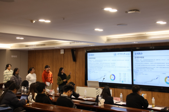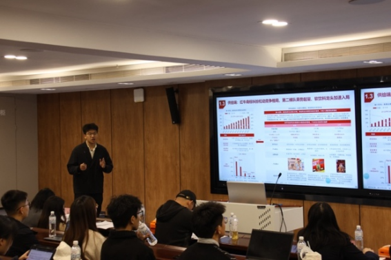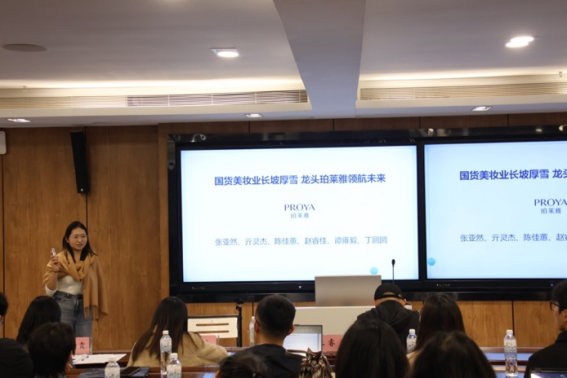 “七分靠打拼队”以“国货美妆业长坡厚雪 龙头珀莱雅领航未来——珀莱雅分析报告”为主题展开汇报,成员由丁圆圆、亓灵杰、谭雍毅、张亚然和赵睿佳组成。报告从宏观政策、经济环境、技术发展等多维度分析美妆行业,呈现其发展历程、市场规模、增长潜力及细分市场趋势。针对珀莱雅,详细阐述其发展历程、品牌战略、产品营销渠道等创新举措,对比上美股份,剖析公司优势与挑战,评估公司估值,展望发展战略并提示风险。评委老师认为该组呈现亮点在于对品牌营销的深入剖析,能解读热点活动背后策略;同时建议在市场风险评估环节对竞品创新动态及潜在替代品多元威胁做进一步预判。