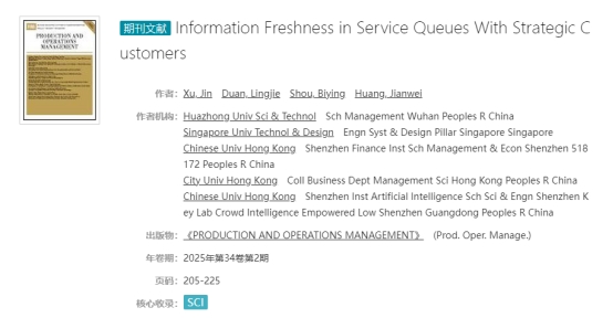 近日,BETWAY必威供应链管理与系统工程系教师徐瑨与新加坡科技设计大学段凌杰教授、香港中文大学(深圳)寿碧英教授、香港中文大学(深圳)黄建伟教授的合作研究成果“Information Freshness in Service Queues With Strategic Customers”在管理学国际顶级期刊《PRODUCTION AND OPERATIONS MANAGEMENT》上发表。