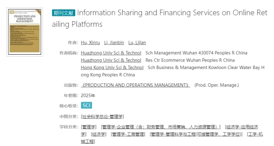 近日,2022级博士研究生、Robust Team成员胡辛茹(第一作者),导师李建斌教授(通讯作者)与香港科技大学卢立建教授合作的研究成果《Information Sharing and Financing Services on Online Retailing Platforms》在管理学UTD24顶级期刊《Production and Operations Management》(简称POMS)上发表。