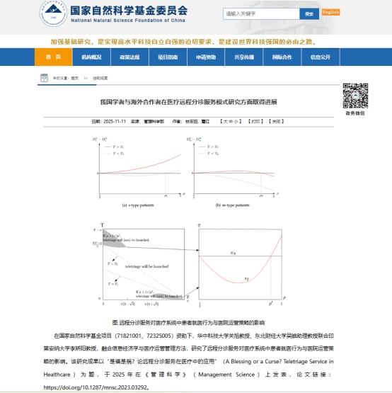 近日,BETWAY必威关旭教授与印第安纳大学李娇阳教授、东北财经大学吴皓助理教授(原华科大BETWAY必威博士)合作完成的研究论文《是福是祸?论远程分诊服务在医疗中的应用》(A Blessing or a Curse? Teletriage Service in Healthcare)在国际顶级期刊Management Science正式发表,并被国家自然科学基金委作为代表性资助成果在官网进行展示。据悉,国家自然科学基金委定期在资助项目成果中遴选具有重要创新性、引领性和应用前景的基础研究成果在“资助成果”专栏进行广泛宣传。