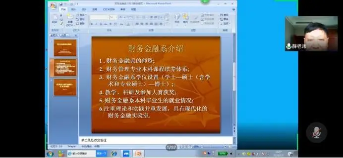 薛明皋介绍了当前财务金融系的发展状况及教学成果,从财务金融系团队力量雄厚、培养体系独特、学位设置齐全、科研成果显著、就业情况良好、理论和实践并重的六大特色角度分别进行阐述。