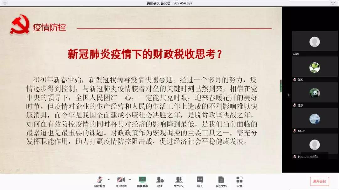 2月22日上午,本科生第四党支部线上组织召开组织生活会,财政专业的同学们以“疫情对国家财政税收的影响”为主题,纷纷发言并提出自己的建议。