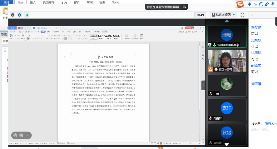 工商管理大类2003班、2004班班助张珊珊同学立足个人的班助工作,向同学们分享了班助工作的主要内容和工作方法。张珊珊认为,班助的主要职责在于协助本科班主任、年级辅导员管理班级事务、参与班级员工培养工作,这要求班助在开展工作的过程中重视工作方法。需要以诚待人发挥班助对本科员工的正向引导作用,树立良好的榜样。