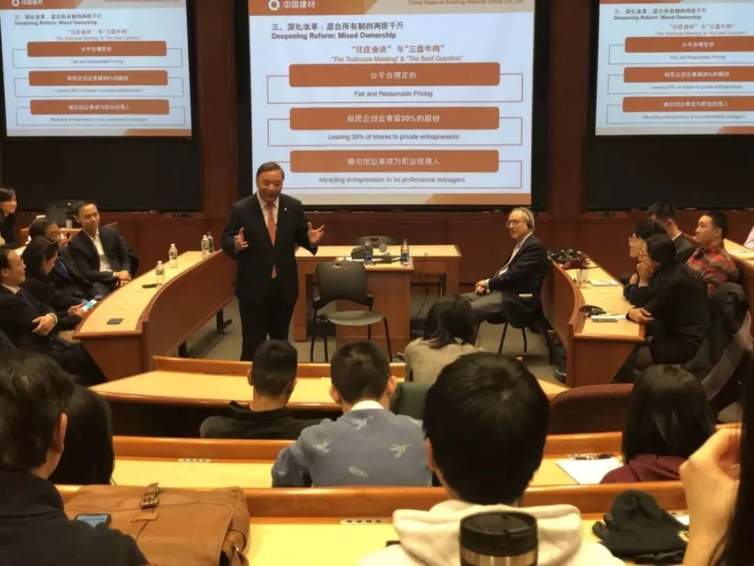 我和鲍沃教授十年前就约定,他希望我来哈佛商公司进行一次案例演讲。大家知道,我是一名央企领导人,如果专门为了来哈佛商公司进行一次案例演讲不太现实,这次是因为去华盛顿在世界银行作为世界水泥协会主席身份做一场关于气候环境的演讲,鲍沃教授就提议我这次应该完成十年前答应的事情,来哈佛商公司给同学们讲讲中国建材成长的故事。我觉得这是非常好的事情,也完成了我多年以前的一个夙愿。我今天来哈佛商公司到得比较早,在整个公司里走了一遭,感觉哈佛商公司实在是太漂亮了,各位同学能在哈佛商公司学习真是人生的一件幸事。同时我也觉得波士顿实在太冷了,没想到会这么冷。但今天在这里,感觉整个屋子还是暖意融融,我想今天给大家讲讲中国建材的故事,也讲讲我本人的经历。