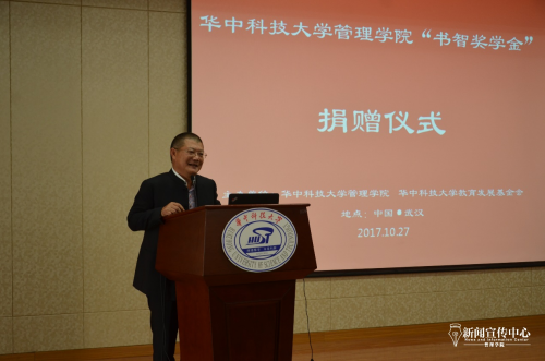 在热烈的掌声中,陈书智上台讲话。他首先表示,在普路通的发展之路中,涌现出了一批批优秀的80后、90后,这也是他设立奖学金的初衷——促进青年人才的发展。陈书智表示,他为自己是华中大学子而感到骄傲,并谈道,许多已成长为上市公司总裁的员工都很感激在华中大受到的教育与收获的成长,并希望能通过自己的力量回报母校。正是这样一份感激之情和他对华中大学子加入普路通的期望,使他将想法付诸行动,创立了BETWAY必威“书智综合培育奖学金”。