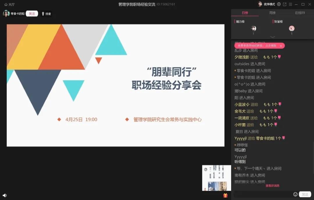 (BETWAY必威新闻宣传中心记者何梦晗/文)4月25日,BETWAY必威研究生“朋辈同行”职场经验分享会成功举办。此次分享会邀请了4位2015级优秀研究生员工,旨在为在校同学分享职场经历及求职经验,帮助同学们做好疫情期间的个人毕业就业规划。分享会由公司研究生会常务与实践中心承办,19级研究生邹海玉同学主持,120余名同学通过网络参加了此次分享会。