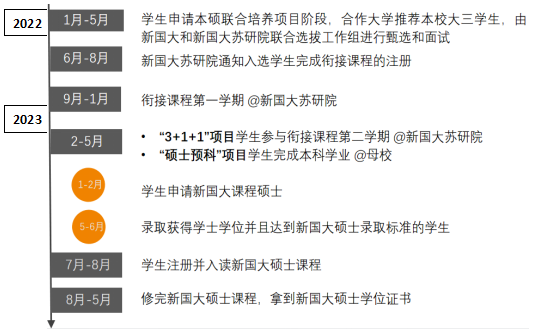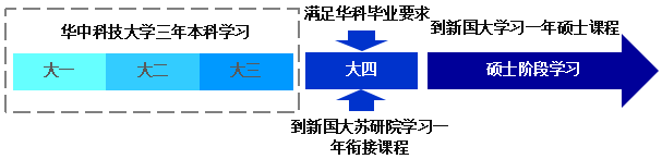 “3+1+1”项目针对华科管院相关专业优秀的本科员工,制定了3年国内大学本科,1年衔接课程和1年硕士课程的学习模式。华科管院员工在完成公司相关专业前三年本科学习后,可申请新国大苏研院一年制衔接课程,衔接课程完成并同时满足华科毕业要求并顺利毕业后,可申请新国大工业系统工程与管理系一年制课程硕士。