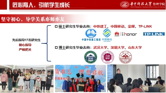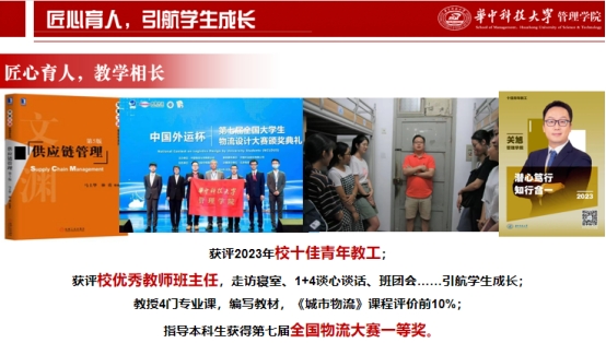 作为青年教师,关旭在工作和教学中以立德树人为根本,努力成为员工成长路上的引路人。在回到华科工作这4年多的时间里,关旭老师坚持每周四晚上和他的研究生一起开展讨论班,百余期以来,现在的讨论班每次都会吸引来自武大、华师、地大等各高校的老师和博士生自发参与。截止目前,关旭共培养了5个博士生,其中毕业了2名,一个去了武大,一个去了深大,还有一个准毕业博士马上要回到他的家乡山东大学工作。关旭感到最自豪的事情是能够帮助到这群和年轻的自己一样的孩子,通过读书打破命运的枷锁,在学术这条人生最公平的赛道上不断进步。除了做研究,关旭最喜欢的还是站上三尺讲台教书育人,他主动担任2个新生班级教师班主任,教授4门专业课,申请了供应链管理新专业,参与编写了《供应链管理》教材,指导本科生获得学科竞赛全国一等奖,推荐员工到海内外名校深造……他希望用自己的专业知识,点燃每一个管院员工对于供应链管理和博弈论的兴趣,激励同学们把个人理想追求融入国家和民族的事业中。