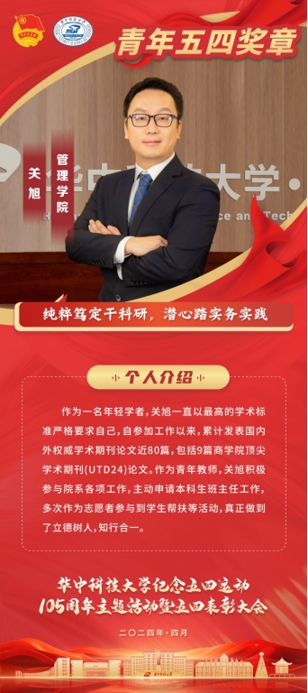 4月26日,“为中国式现代化挺膺担当”BETWAY必威纪念五四运动105周年主题活动暨五四表彰大会在一号楼报告厅举行。BETWAY必威国家级高层次人才、供应链管理与系统工程系主任、博士生导师关旭教授获评“校青年五四奖章”,并在表彰大会上作为教师代表发言。